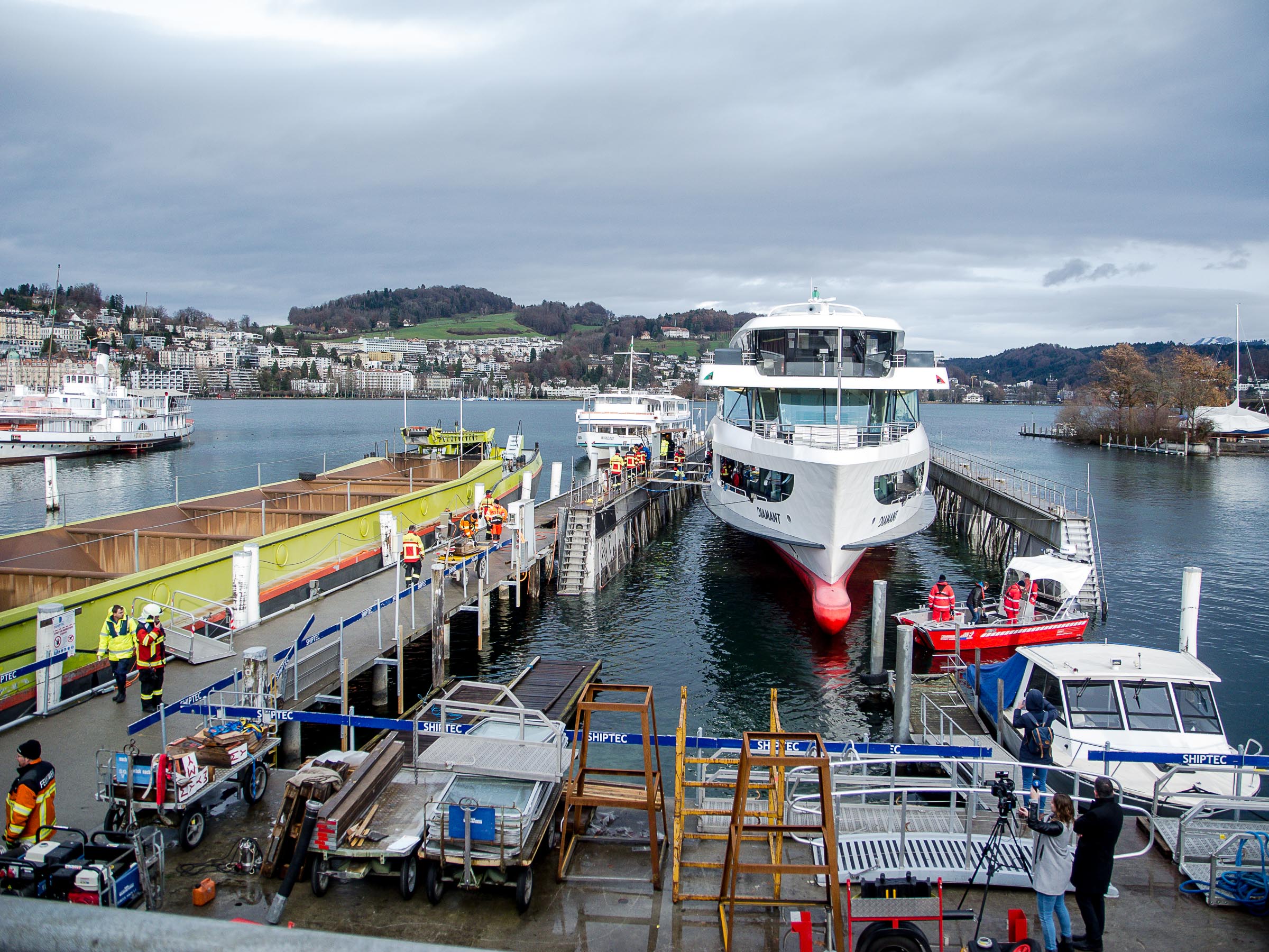 In Luzern wird am kantonalen Feiertag das Schwimmdock bereit gemacht. Das Schwimmdock, das nach Plänen von Gebrüder Sulzer aus Winterthur im Sommer 1907 gebaut wurde, kann in der Ursprungsversion bis 400 t aus dem Wasser hieven. Mit dem Ausbau der drei Schwimmkörpern auf vier Pontons können 500 t gehoben werden.