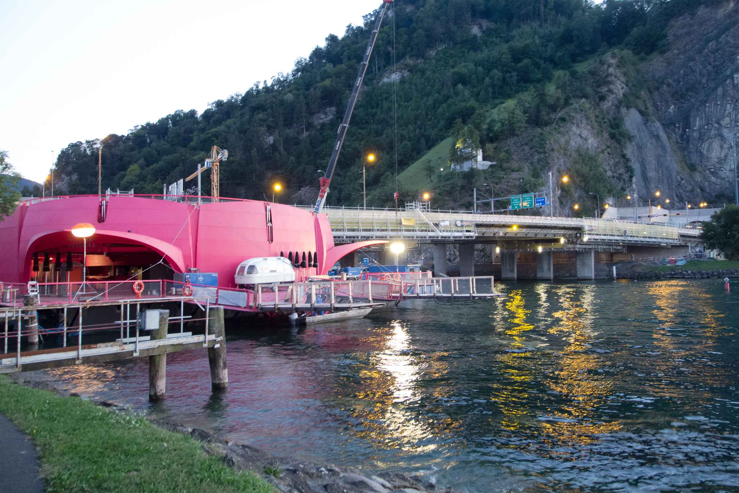 unter der Achereggbrücke in den Alpnacher Arm des Vierwaldstättersee's verschoben. Dazu mussten zuerst die Blütenblätter abmontiert werden. Weiter wurden Teile der Plattform demontiert und auf Lastschiffe verladen. Durch das Fluten der Wassertanks mit Seewasser konnte die Seerose ca. 1 m tiefer gelegt werden. Damit war die Durchfahrt unter der Autobahn-, Eisenbahn-, Autostrasse- und Fusswegbrücke möglich. Durch das Fluten der beiden äusseren Pontons mit einem Fassungsvermögen von 860'000 l Wasser, wird die 500 t schwere Seerose zusätzlich tiefer gelegt. Mindestens 30 cm Freiboard zwischen oberer Wasserlinie und Unterkant Blütenblätter müssen eingehalten werden.