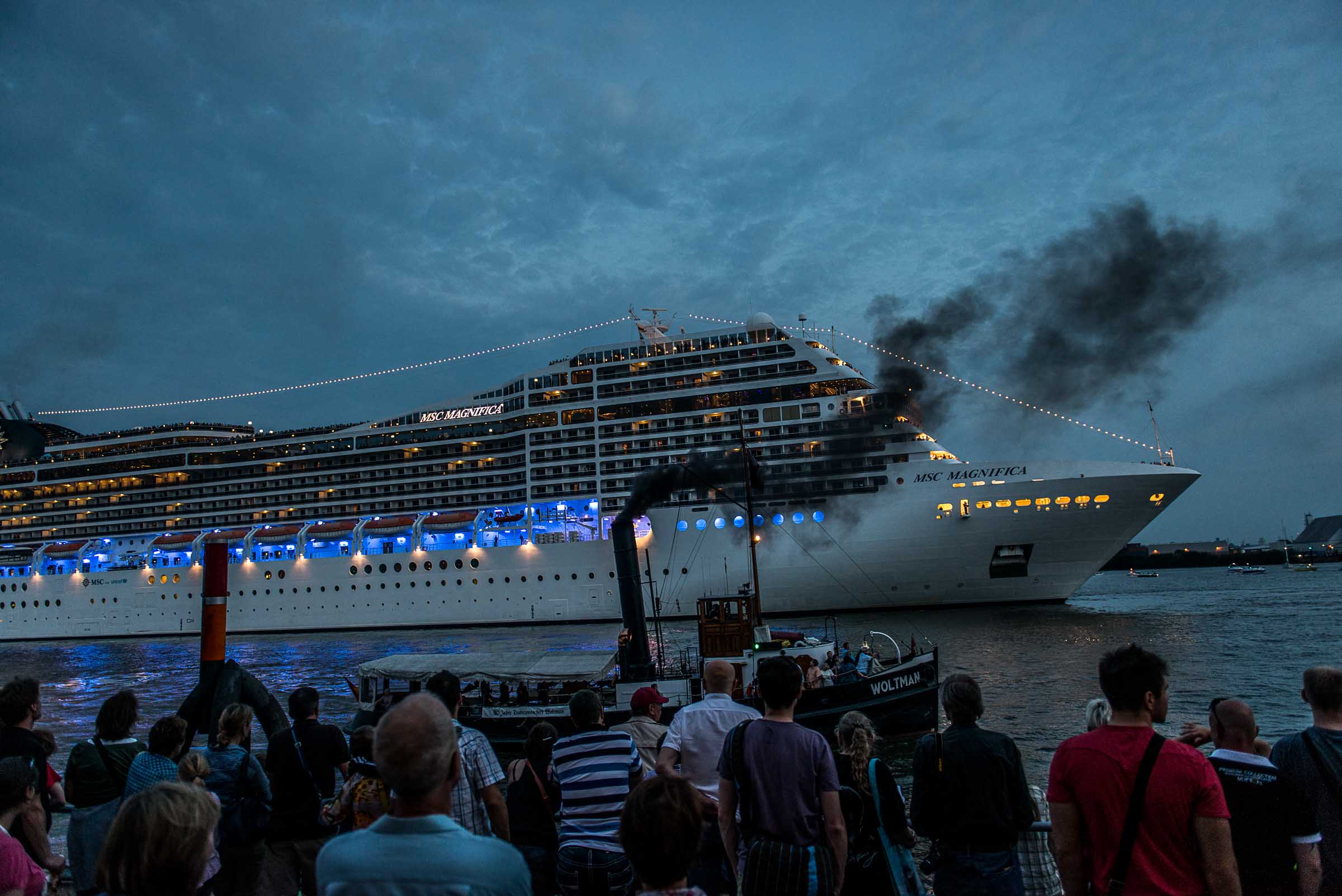 Anlässlich der Cruise Day2014 sind MS EUROPA, die AIDAstella, die MSC Magnifica, und die DEUTSCHLAND ausgelaufen. Die Schiffe sind an der Anlegestelle im Ueberseequartier festgebunden. Diverse Wendemanöver vor dem Auslaufen faszinieren die  Besucher die sich am späten Nachmittag auf dem Gelände eingefunden haben.